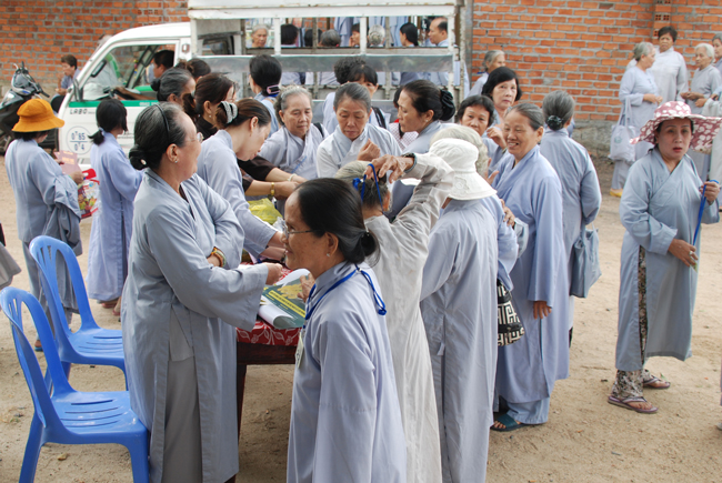 Kết thúc buổi lễ, quý Phật tử hân hoan ra về với phần quà Pháp bảo được thầy bổn sư trao tặng VCD 5 Báu Khó Tìm.