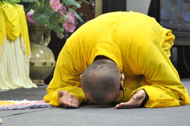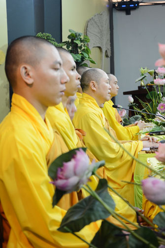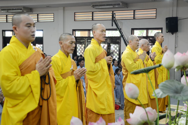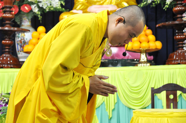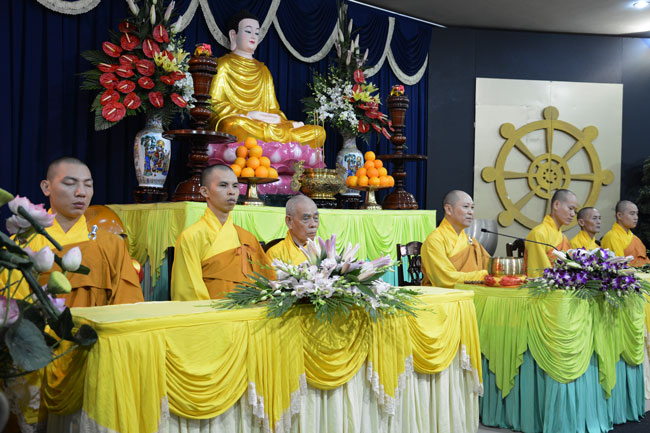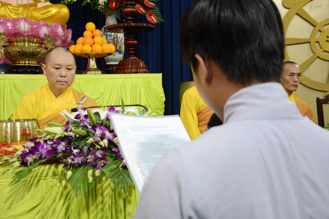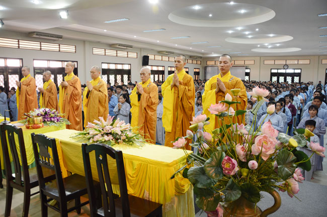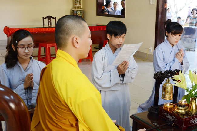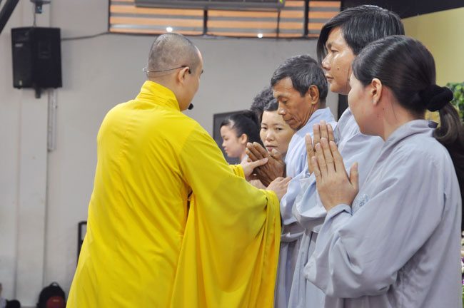 Vào 14h, thiện nam tín nữ chính thức bước vào lễ quy y Tam Bảo. Trong không khí trang nghiêm thanh tịnh, buổi lễ được bắt đầu bằng nghi thức dâng hương, lễ Phật, khai đàn. Sau đó, Thượng tọa Thích Chân Tính, trụ trì chùa Hoằng Pháp chính thức truyền Tam quy, Ngũ giới cho các thiện nam tín nữ.
