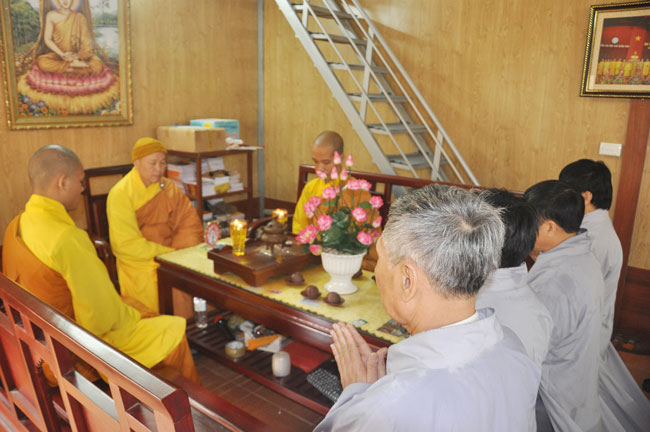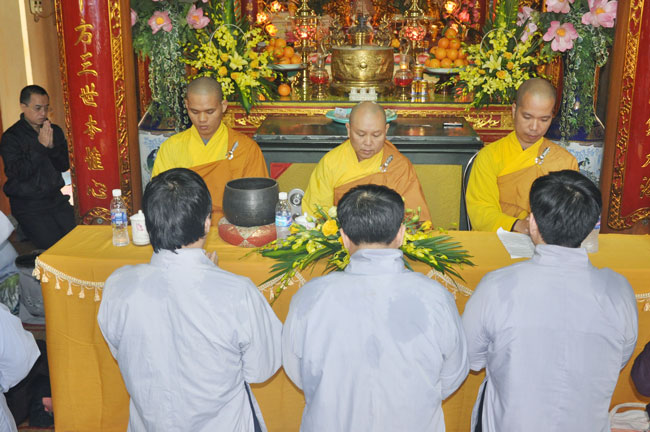 Buổi lễ chính thức được bắt đầu vào lúc 9h00, Thượng tọa cùng Đại đức Thích Tâm Tịnh và Đại đức Thích Tâm Lộc quang lâm Đại hùng bảo điện tác pháp niêm hương bạch Phật, khai đàn truyền trao tam quy ngũ giới.