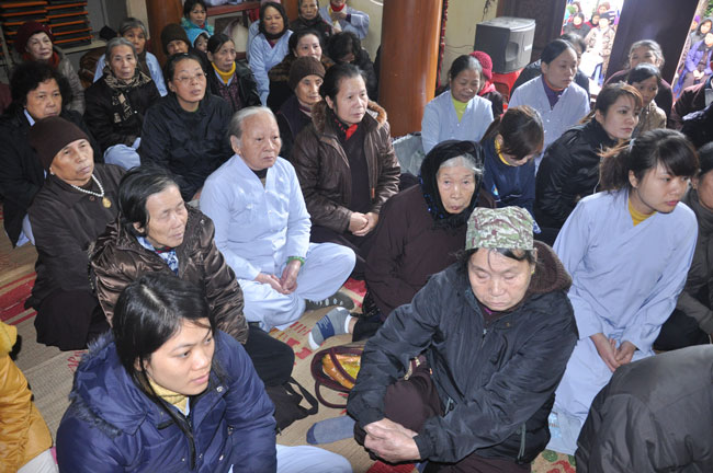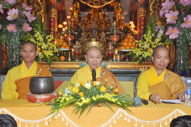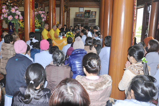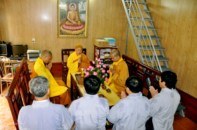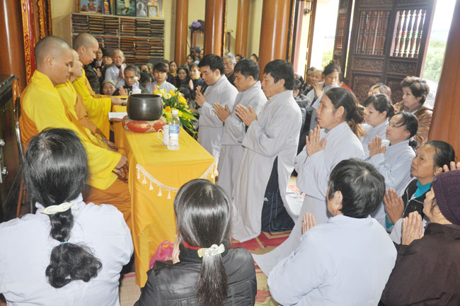 Sau đó, đại diện quý thiện nam tín nữ đã dâng lên chư Tôn đức lời tác bạch cầu thỉnh truyền giới. Trước khi chính thức làm lễ truyền giới, Thượng tọa đã ân cần thuyết giảng về ý nghĩa tam quy và ngũ giới, cùng một số oai nghi căn bản của người Phật tử cho hàng thiện tín. Dù thời tiết mưa phùn lất phất, cái lạnh phủ trùm lên tất cả, song với tấm lòng tất cả vì Phật pháp, Thượng tọa đã động viên quý Phật tử tinh tấn tu tập, giữ gìn ba nghiệp, luôn nêu cao chính kiến để có được cuộc sống an lạc và hạnh phúc. Cả chính điện dường như ấm hẳn lên trong cái giá lạnh của thời tiết.