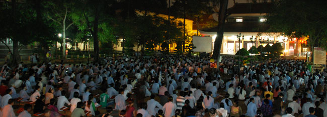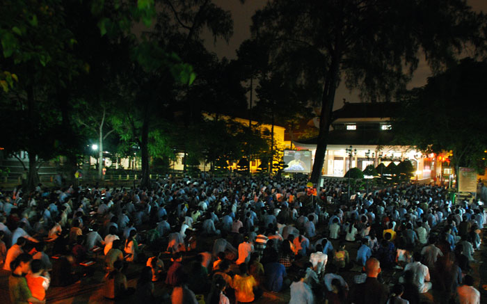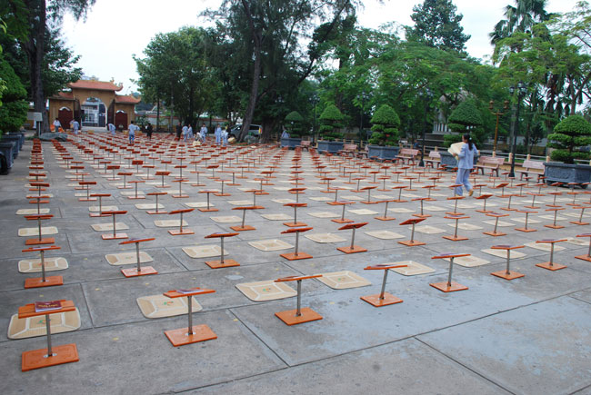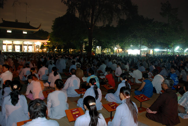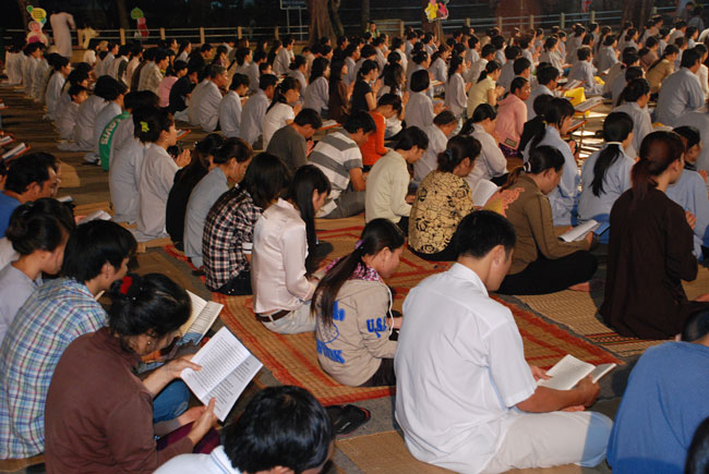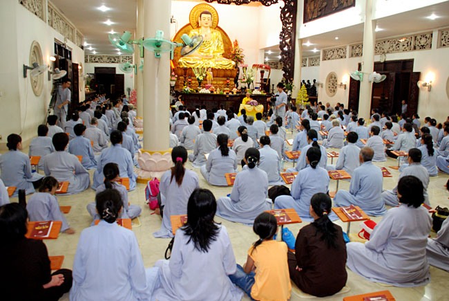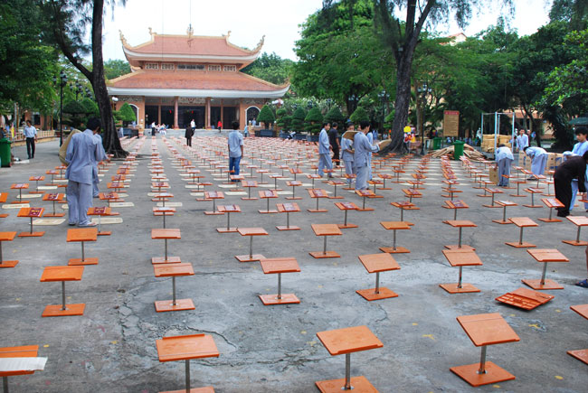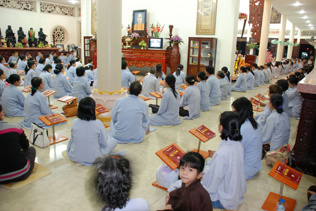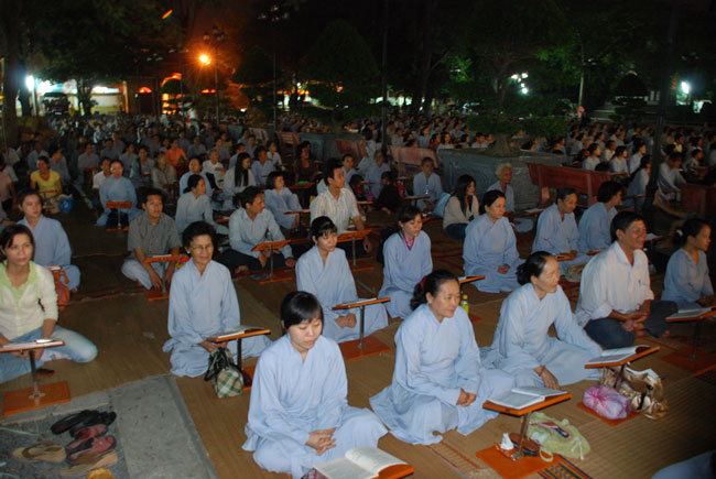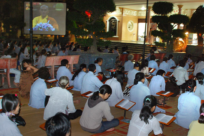 Do chánh điện không đủ chỗ nên Phật tử ngồi cả ra trước sân chùa và các khu giảng đường. Rất may mắn là sau buổi lễ trời đổ mưa.