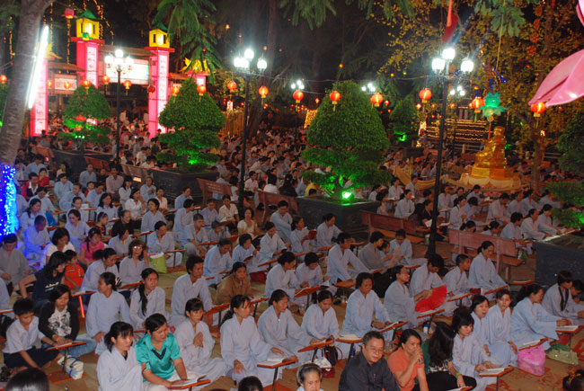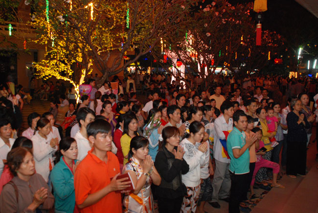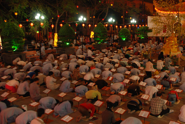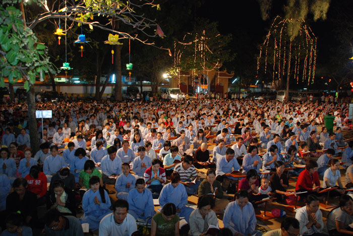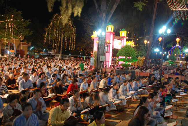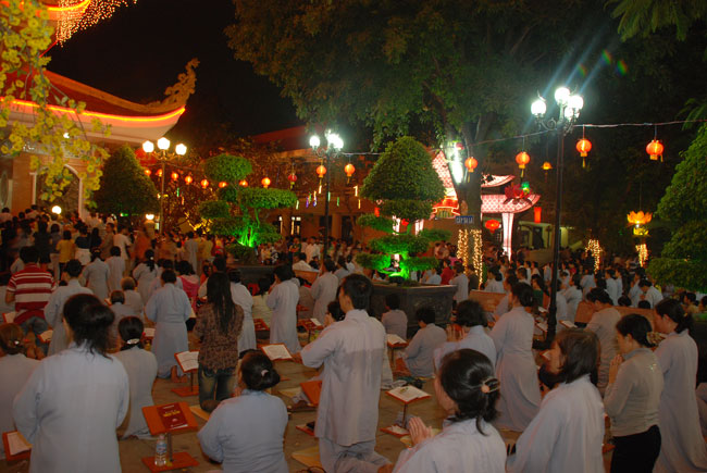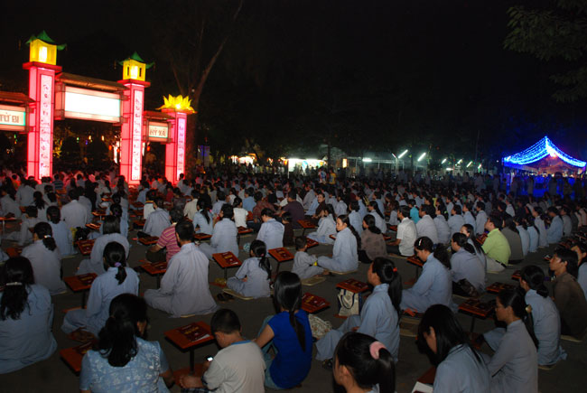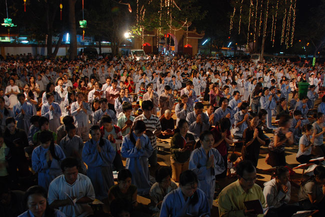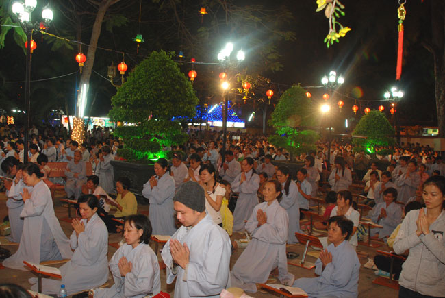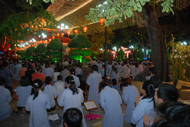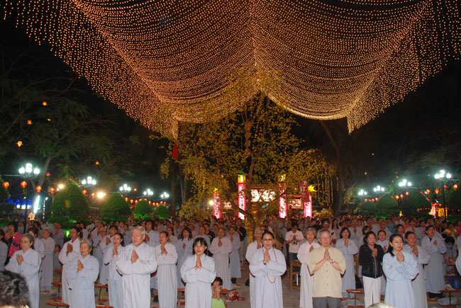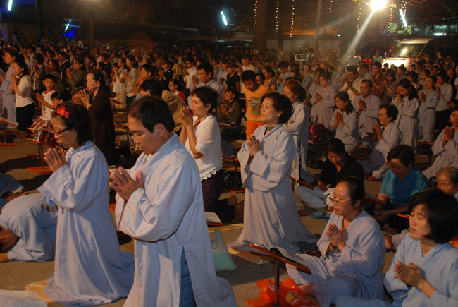 Mọi người tụng Hồng danh bảo sám và đồng thanh niệm Phật dưới ánh sáng đèn sân chùa không tỏa đủ khắp, nhưng chắc hẳn trong lòng người con Phật luôn được soi sáng dưới ánh đạo vàng của Chư Phật mười phương gia trì trong từng lời khấn nguyện chân thành, cầu nguyện chúng sinh được an lạc, âm siêu dương thới pháp giới chúng sinh đồng thành Phật đạo.