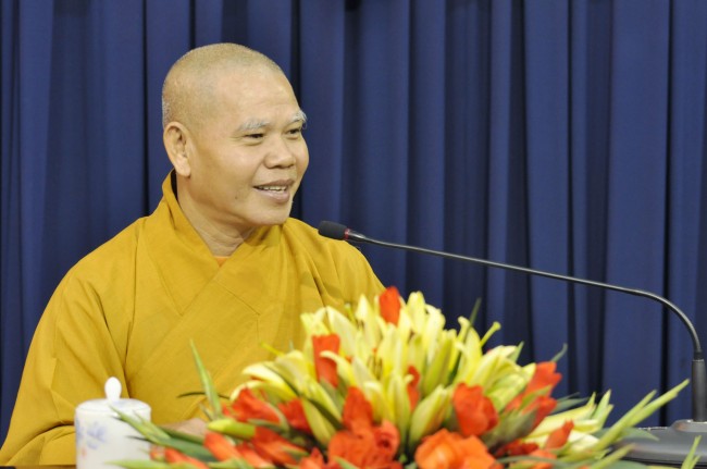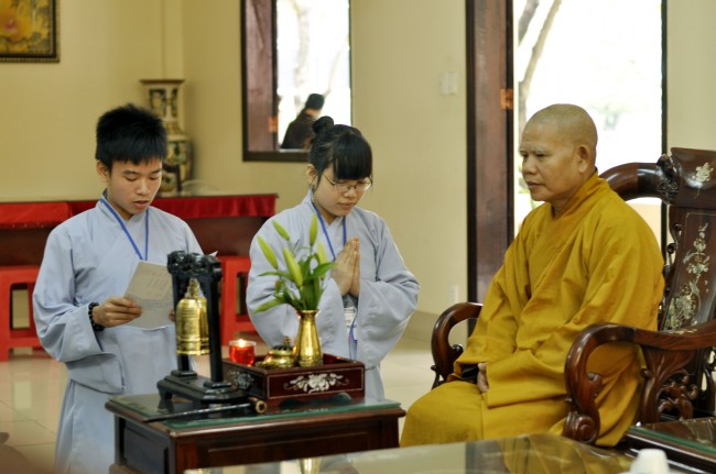 Mở đầu ngày tu học, các bạn sinh viên được lắng nghe thời pháp thoại do TT. Thích Hạnh Bình, Giám đốc trung tâm Phật học Hán truyền, giảng viên Học viện Phật giáo Việt Nam tại TP. HCM thuyết giảng đề tài Hiện tại lạc trú. Hiện tại lạc trú là pháp an trú trong hiện tại mang lại an lạc. Vì vạn pháp là vô thường, luôn luôn biến đổi, hoạt diệt, vì vạn pháp là vô ngã, vì vạn pháp là duyên sinh, nương nhau mà tồn tại, không có điểm khởi đầu và kết thúc. Do vậy, đặt tâm truy tìm, nhớ tưởng về sự kiện quá khứ không còn liên quan đến sự sống hiện tại, hay đặt tâm ước vọng về những điều viển vông, xa vời, chưa xảy đến ở tương lai thì đều không có ích lợi. Chỉ có hiện tại mới là sự sống đích thực.