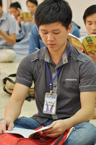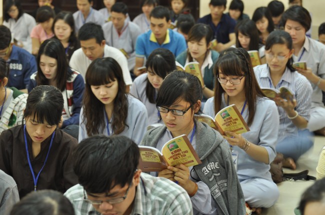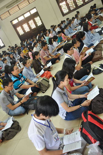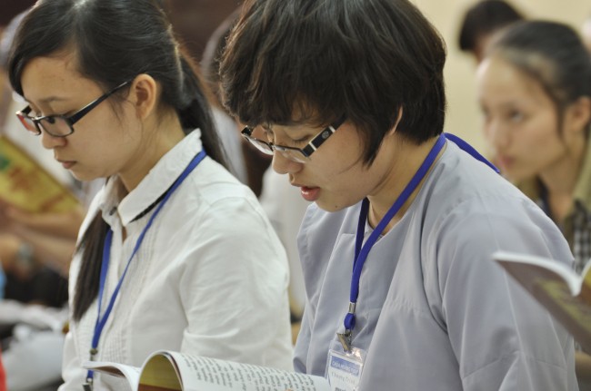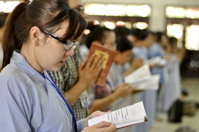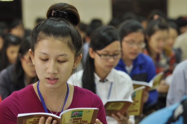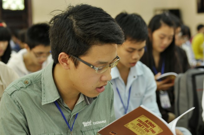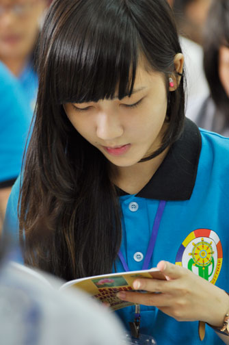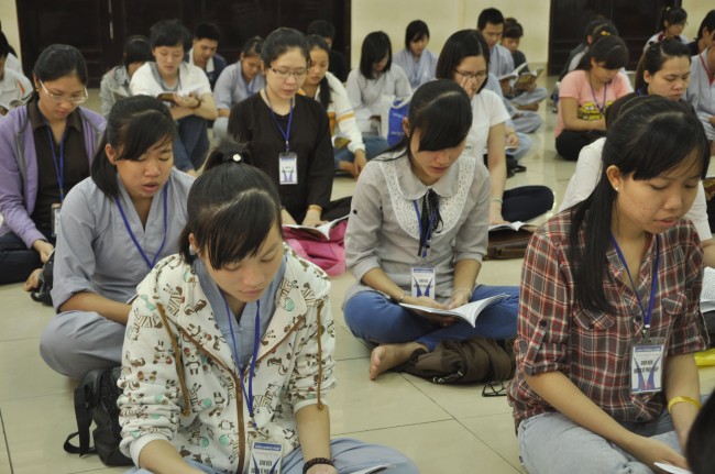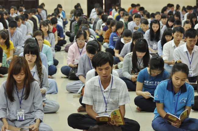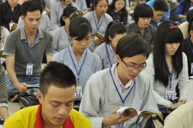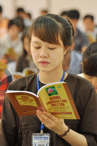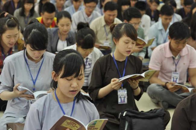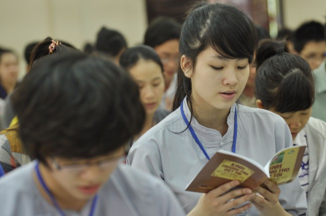 Vào 14h, ngày tu tiếp tục bằng thời tụng kinh “Diệt tội trường thọ”. Trong không khí trang nghiêm, thanh tịnh của giảng đường, các bạn sinh viên đều đồng nhất tâm tụng niệm.