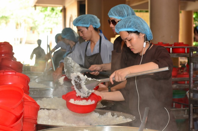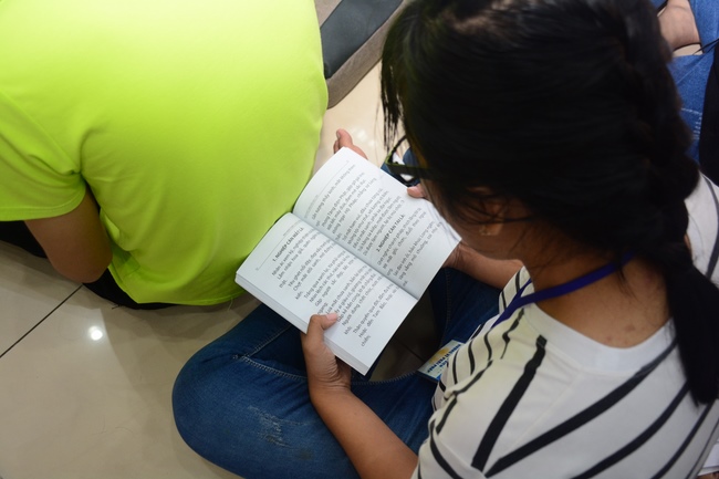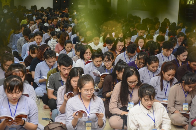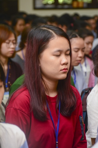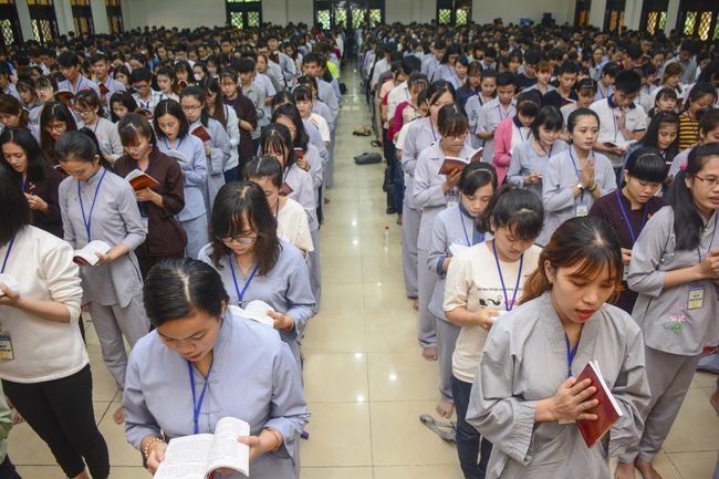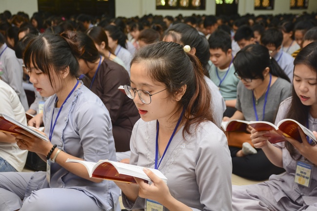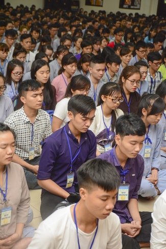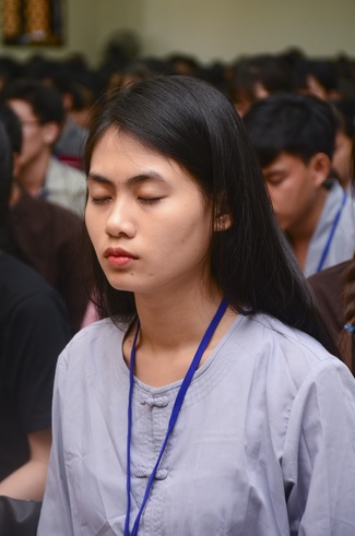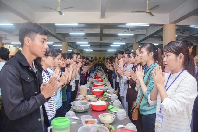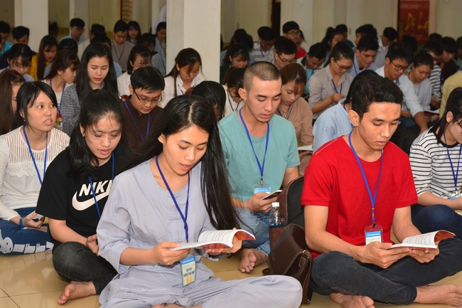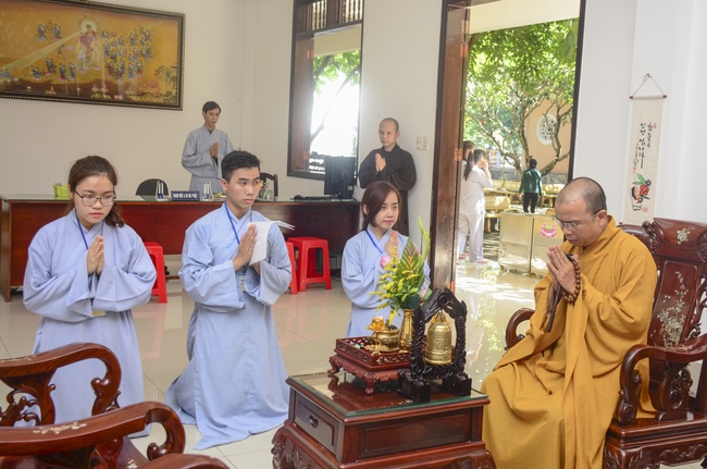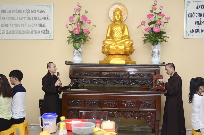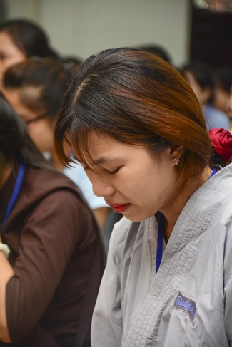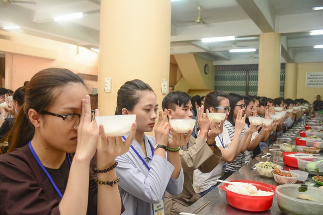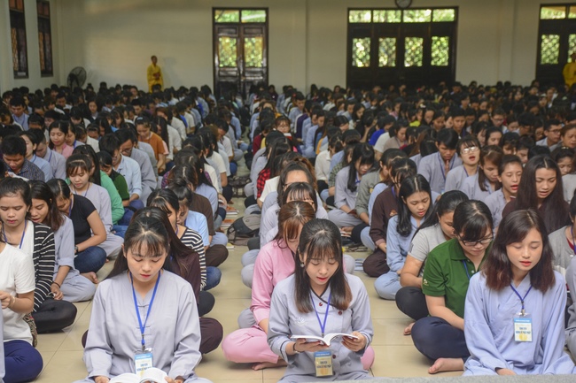 Vào buổi sáng của ngày tu,sau khi dùng điểm tâm sáng, các bạn tập trung lên giảng đường chính để cùng tụng bài kinh “Sám Hối Sáu Căn” dưới sự hướng dẫn của quý thầy.