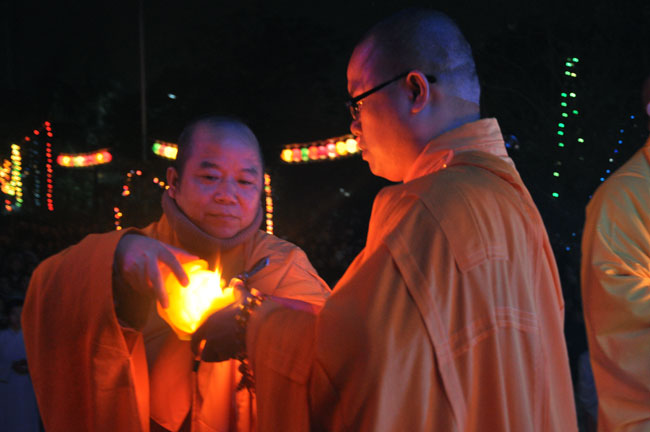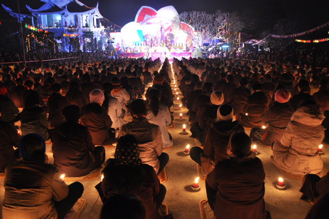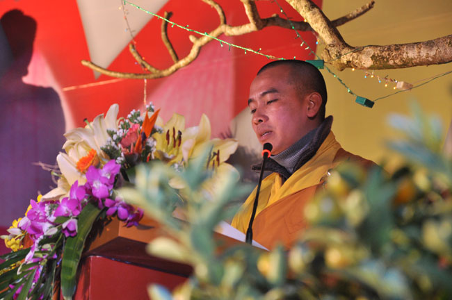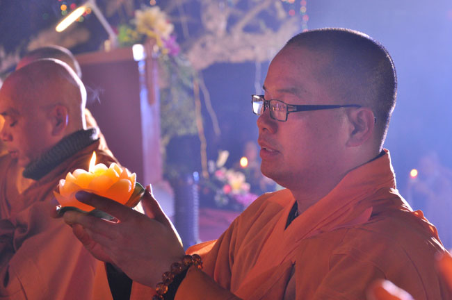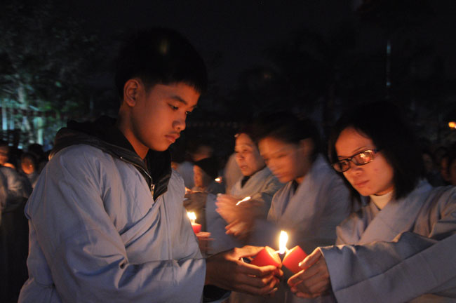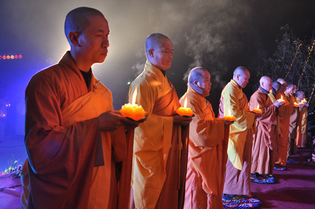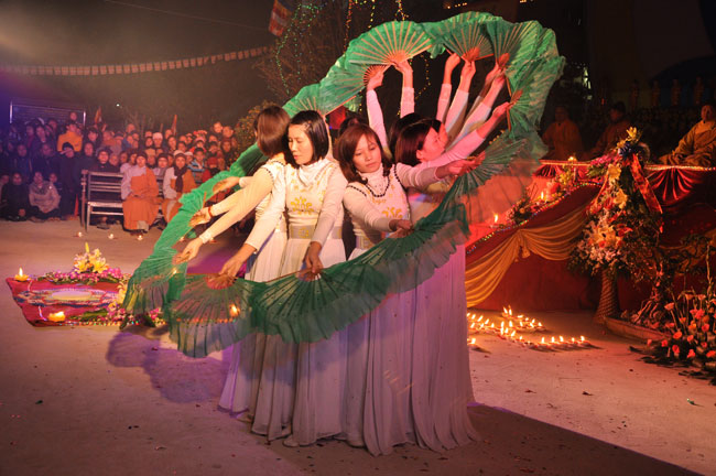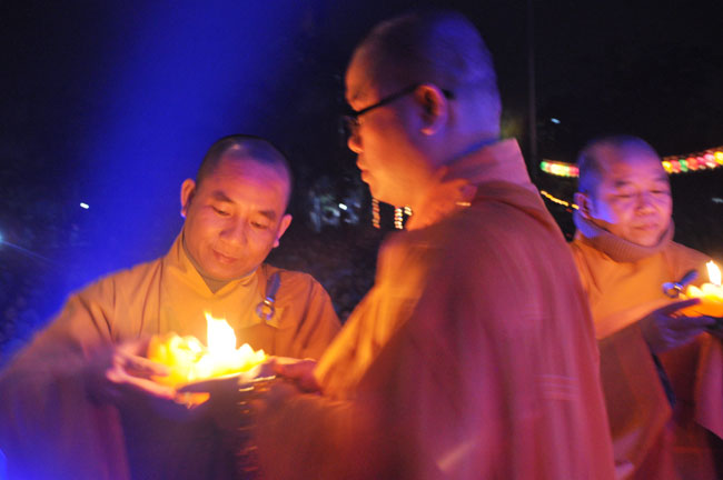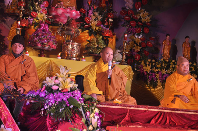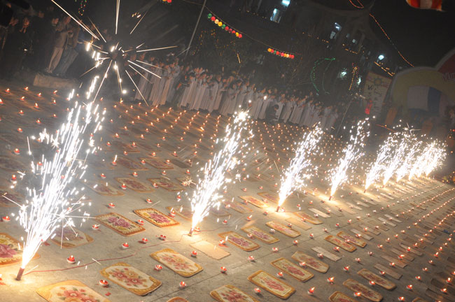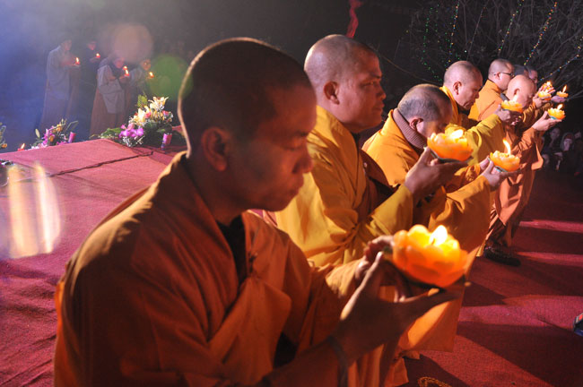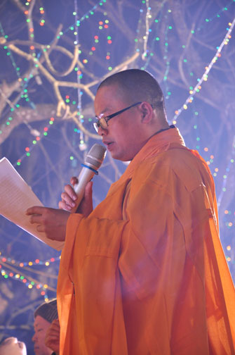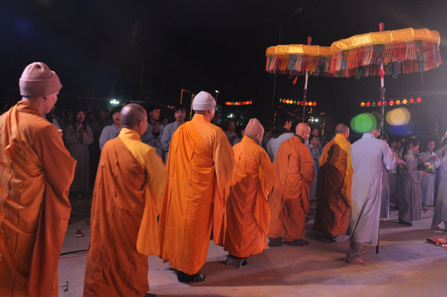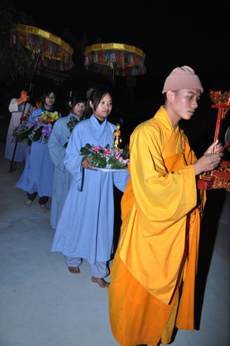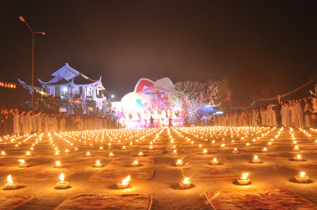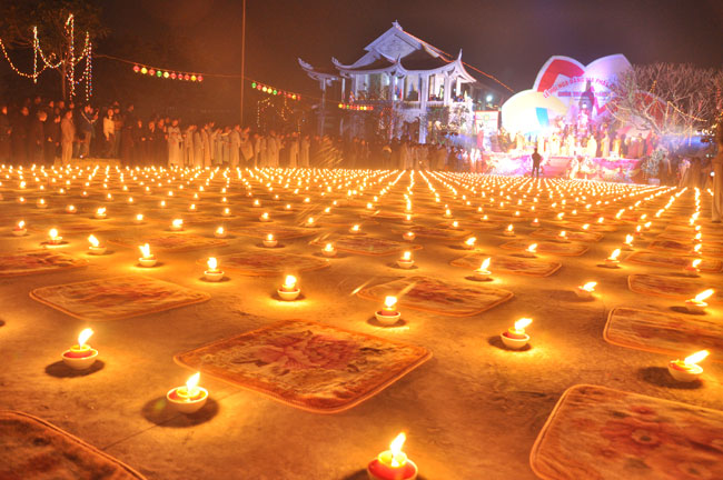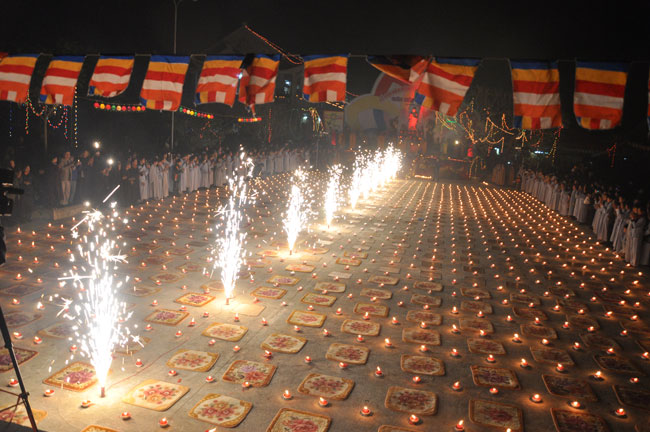 Buổi tối 19h00, hàng nghìn Phật tử và dân làng địa phương đã vân tập trang nghiêm trước sân lễ để được chiêm ngưỡng đêm hội hoa đăng. Thượng tọa cùng chư tôn đức Tăng Ni với màu y vàng rực rỡ, từng bước an lạc tiến về lễ đài chứng minh cho buổi lễ trong tiếng niệm Phật trầm bổng cung nghinh của quý Phật tử. Qua phần nghi lễ , Thượng tọa ban đạo từ cho chúng hội nhận biết được vấn đề Tự lực và Tha Lực. Cuối cùng Thượng tọa khuyên đại chúng hãy tự mình tinh tấn tu tập và nương nhờ vào cảnh giới của Chư Phật để chóng được giải thoát.