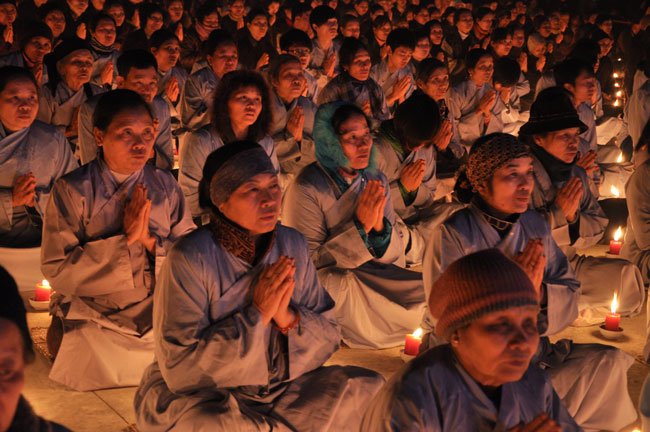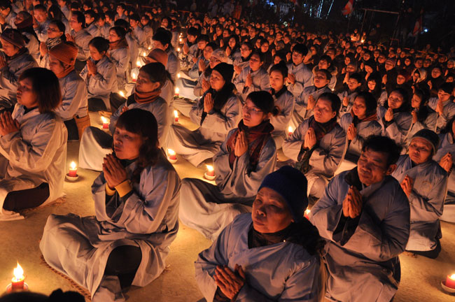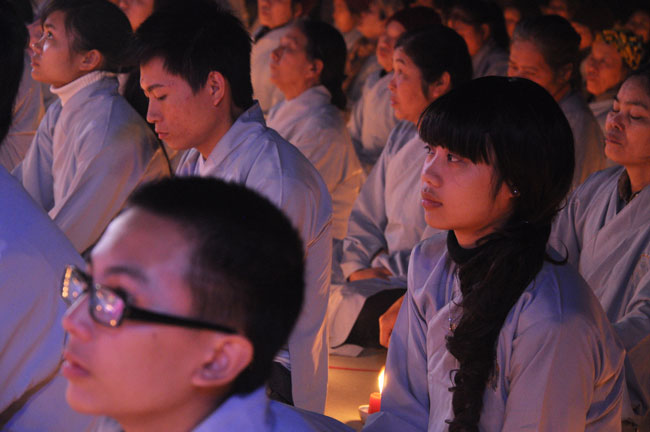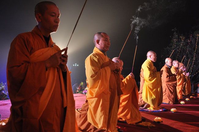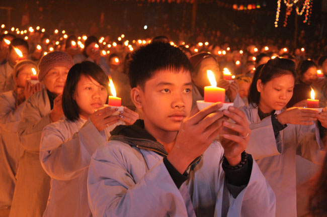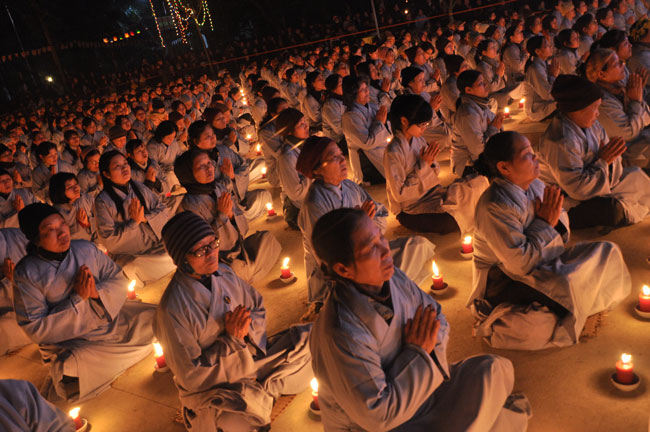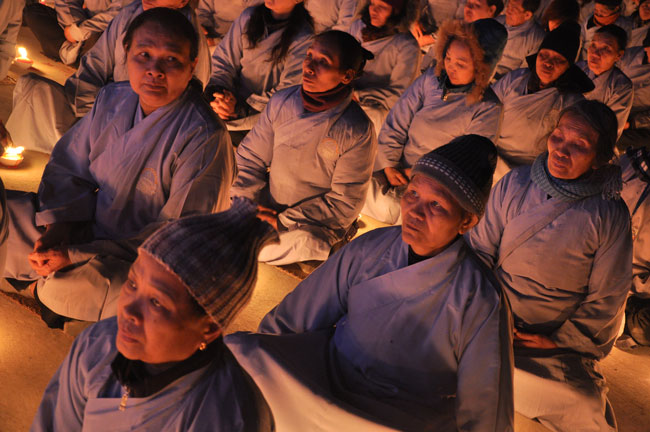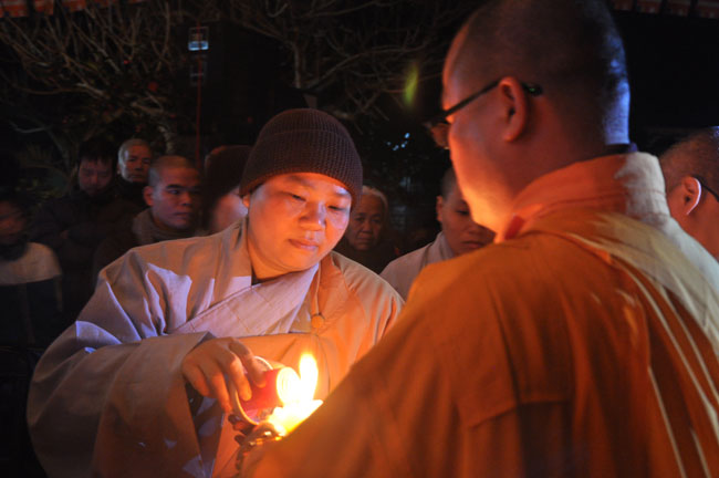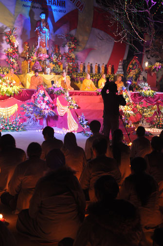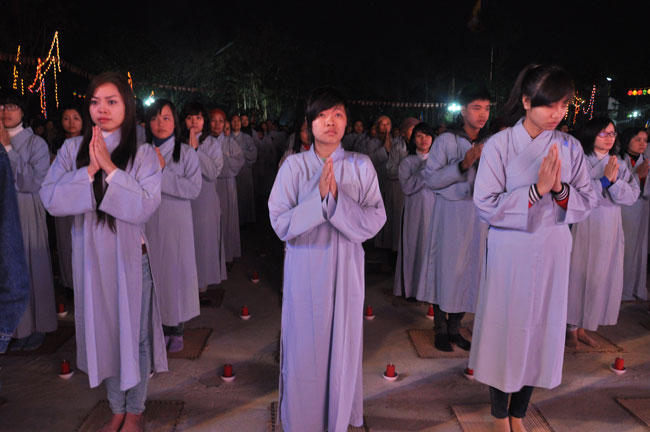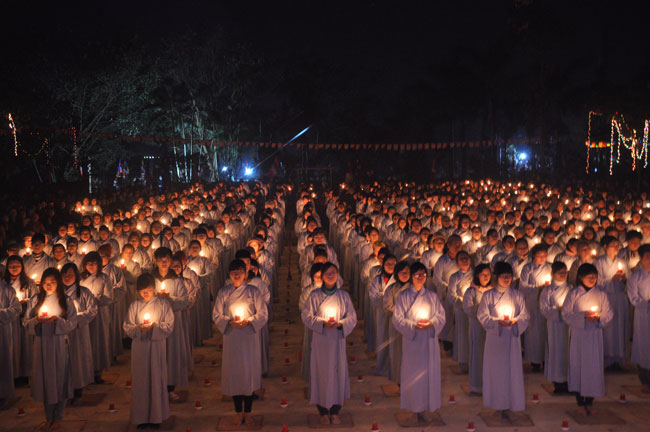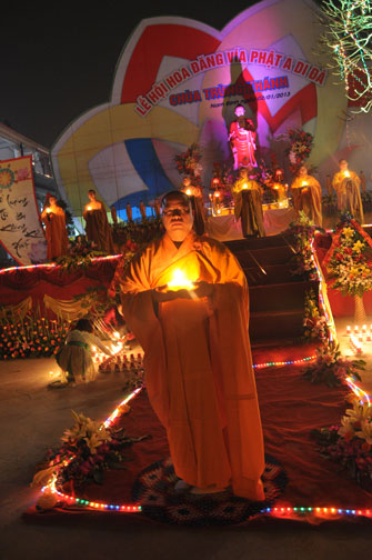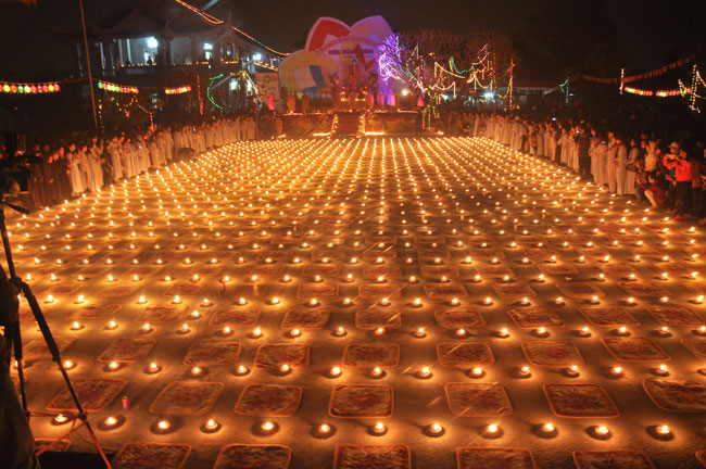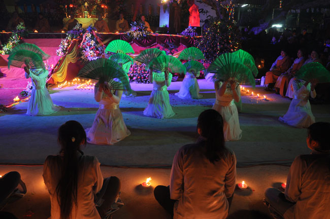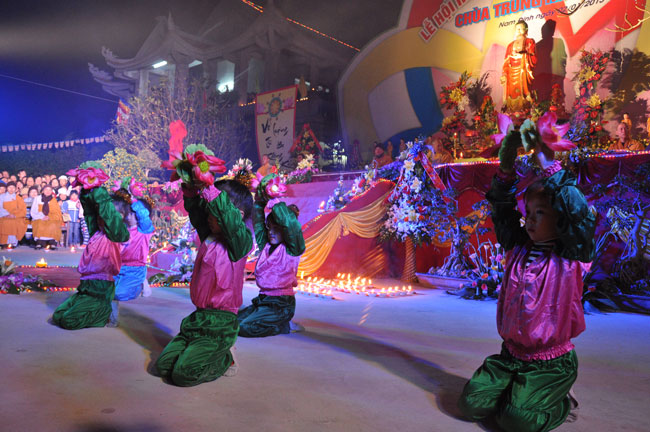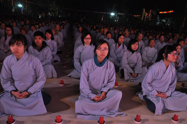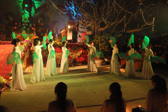 Buổi tối 19h00, hàng nghìn Phật tử và dân làng địa phương đã vân tập trang nghiêm trước sân lễ để được chiêm ngưỡng đêm hội hoa đăng. Thượng tọa cùng chư tôn đức Tăng Ni với màu y vàng rực rỡ, từng bước an lạc tiến về lễ đài chứng minh cho buổi lễ trong tiếng niệm Phật trầm bổng cung nghinh của quý Phật tử. Qua phần nghi lễ , Thượng tọa ban đạo từ cho chúng hội nhận biết được vấn đề Tự lực và Tha Lực. Cuối cùng Thượng tọa khuyên đại chúng hãy tự mình tinh tấn tu tập và nương nhờ vào cảnh giới của Chư Phật để chóng được giải thoát.