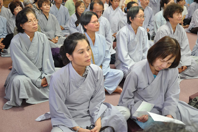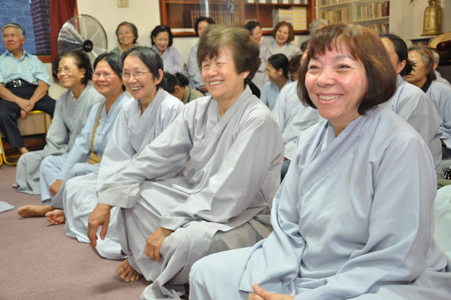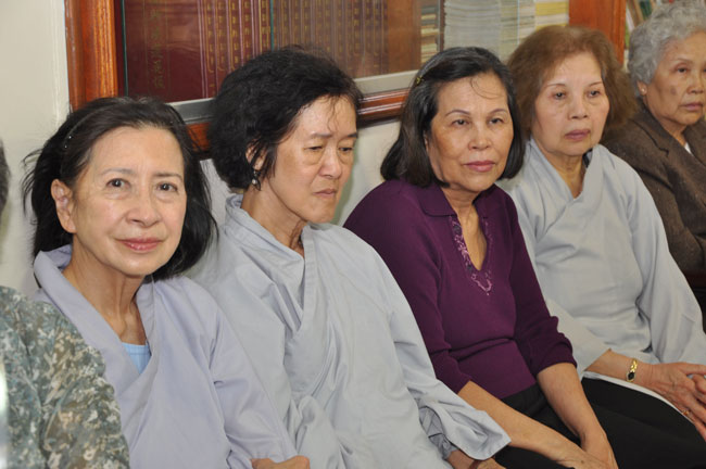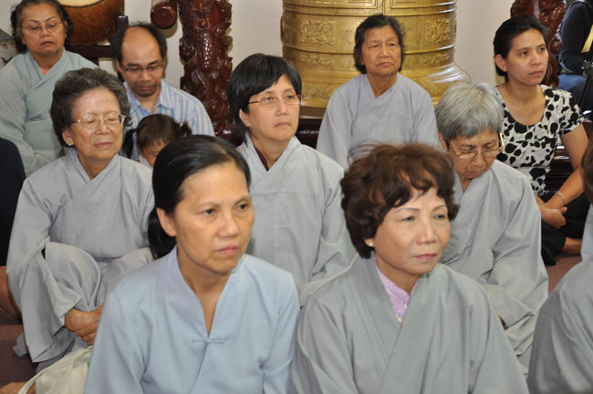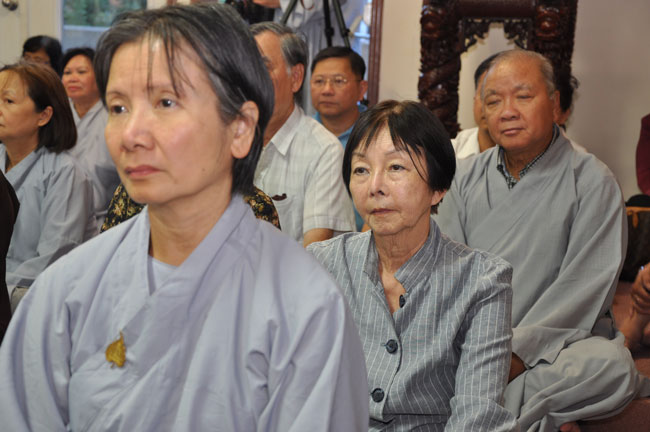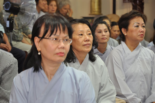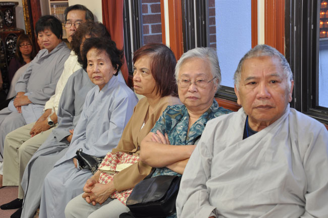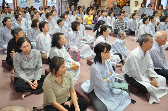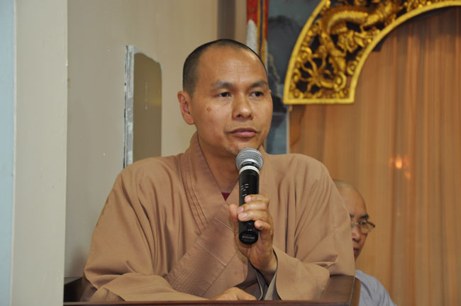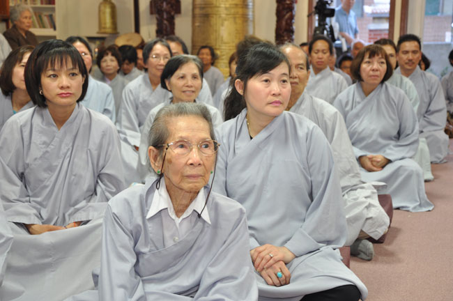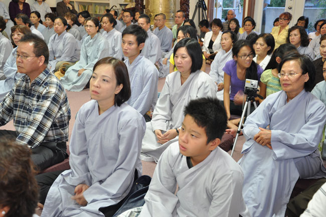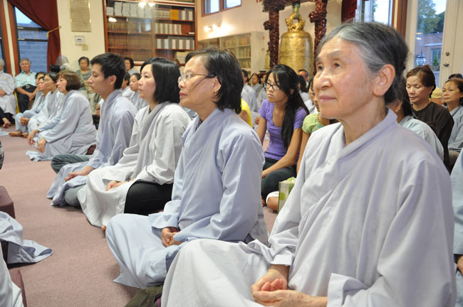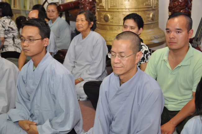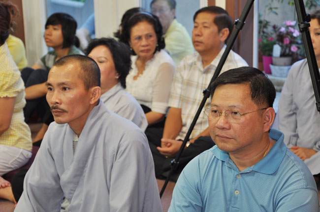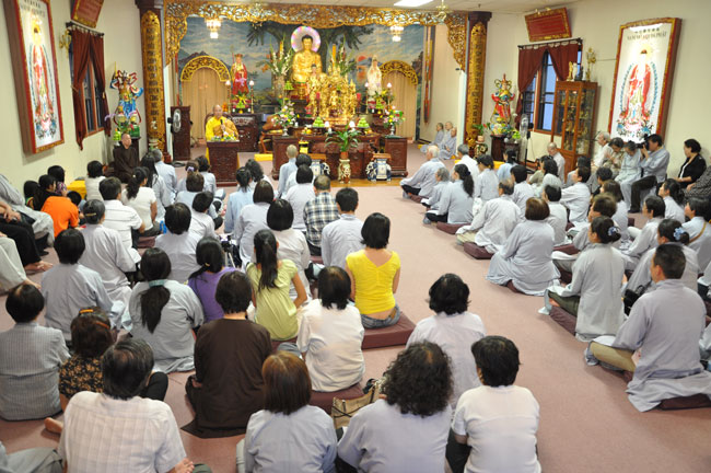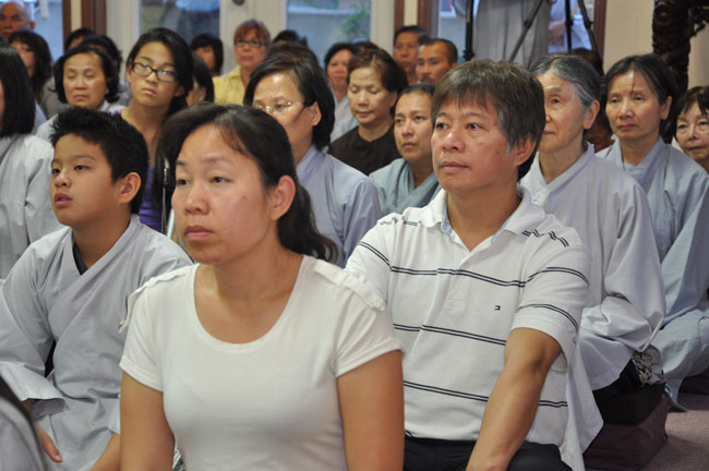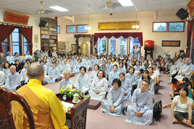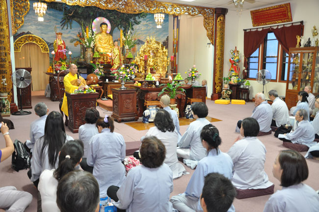 Tối cùng ngày, TT. Thích Chân Tính tiếp tục có thời thuyết giảng cho hơn 200 Phật tử tại Chùa Quan Âm 3781, de Courtrai, Montreal, Quebec, H3s 1B8, Canada do Thượng toạ Thích Trường Phước trụ trì. Được biết nhị vị Thượng toạ là bạn học cùng nhau tại Phật Học Viện Thiện Hoà Chùa Giác Ngộ vào những năm 80. Với đề tài Tam Phước Tịnh Nghiệp trong kinh Quán Vô Lượng Thọ : “Hiếu dưỡng cha mẹ, phụng sự sư trưởng, từ tâm bất sát, tu Thập Thiện nghiệp – Thọ trì Tam Quy, đầy đủ các giới, không phạm oai nghi – Phát Bồ Đề tâm, tin sâu nhân quả, tụng đọc đại thừa, khuyến tấn người tu hành”, Thượng toạ đã phân tích là người tại gia hay xuất gia khi phát tâm tu tập nên nhận thức rõ trách nhiệm và bổn phận của mình, muốn thành tựu Phật quả trước hết phải có lòng hiếu kính cha mẹ, tu các nhân lành và nuôi dưỡng lòng từ bi. Để trở thành người đệ tử chân chính của đức Phật, phải giữ gìn năm giới, luôn chánh niệm trong từng hành động, lời nói hay suy nghĩ của mình, giữ oai nghi trong lúc đi đứng nằm ngồi. Hơn nữa, phải tin sâu nhân quả, luôn luôn nuôi dưỡng tâm Bồ Đề, lập nguyện rộng lớn khuyến hoá người biết nương Phật pháp tu hành. Đây là ba điều kiện căn bản và không thể thiếu đối với một hành giả tu tập, nếu nỗ lực thực hành chắc chắn sẽ có nhiều lợi ích trong hiện tại và tương lai.