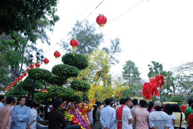 Đêm nay, Hoằng Pháp đẹp quá! Đẹp lộng lẫy như một bức tranh hoàn hảo. Đứng từ trên tầng cao nhất của giảng đường ngắm nhìn toàn cảnh thì thật là tuyệt đẹp. Hoằng Pháp ngập tràn trong ánh sáng lung linh, cảnh chùa mỗi lúc một đông hơn nhưng không ồn ào hối hả. Tiết trời hơi se lạnh, nhìn các em bé được mẹ đưa đến chùa mới đáng yêu làm sao, giờ này cũng đã khuya rồi mà không đòi mẹ đi ngủ như mọi ngày, dường như bé cũng cảm nhận được hơi ấm của mùa xuân đang từng bước tràn về, để rồi bé chờ đợi bằng cả sự hồn nhiên long lanh trong mắt bé. Quả là một bức tranh sống động nhưng lại rất tôn nghiêm. Hướng mắt về một góc khác của khuôn viên chùa là đoàn múa lân múa rồng đã chuẩn bị xong xuôi chỉ chờ giờ phút thiêng liêng của năm mới sẽ ra biểu diễn. Sân chùa hôm nay không chỉ có những tà áo Lam quen thuộc mà còn có rất nhiều màu áo khác của du khách thập phương, họ cũng hoan hỷ trở về nơi tâm linh đón chào năm mới sau một năm bộn bề công việc.