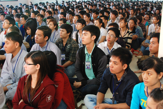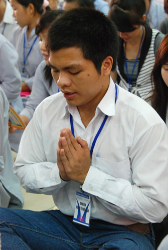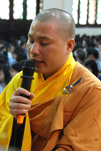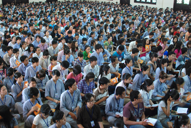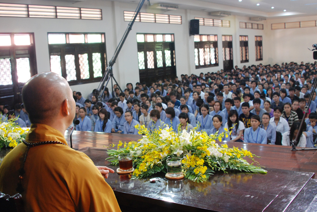 Sau khi dùng điểm tâm sáng, các bạn sinh viên được hướng dẫn vân tập về các khu vực giảng đường để cung nghinh Đại đức Giảng sư Thích Quang Thạnh. Trong thời pháp mở đầu ngày tu, Đại đức Giảng sư đã chia sẻ với các bạn về chủ đề Tuổi trẻ, tình yêu và lý tưởng. Thông qua việc phân tích từng khía cạnh của tuổi trẻ, tình yêu cùng lý tưởng sống, Đại đức Giảng sư đã đem đến cho các bạn trẻ một định hướng đúng đắn trong hành trang vào đời. Tuổi trẻ được ví như mùa xuân tràn đầy nhựa sống, nhưng cũng rất bồng bột và nông nổi. Cho nên, lý tưởng là mục đích cả cuộc đời mà ta phải làm “cách mạng” không ngừng để đạt đến. Tình yêu trước hết phải bắt nguồn từ tình yêu thương cha mẹ, bạn bè, ân sư... và hết thảy mọi loài. Có như vậy, chúng ta mới có sự vững vàng và chín chắn để không bị cuốn vào vòng xoáy khổ đau của tình yêu nam nữ thường tình.