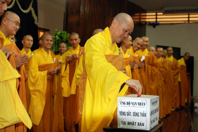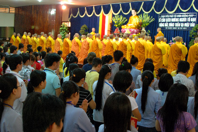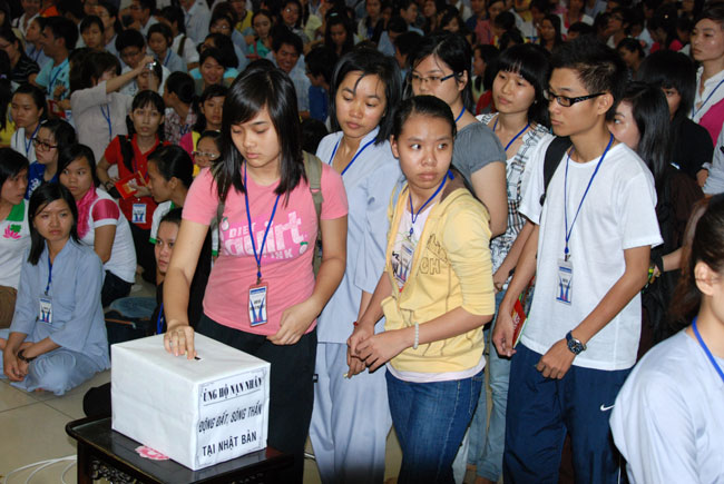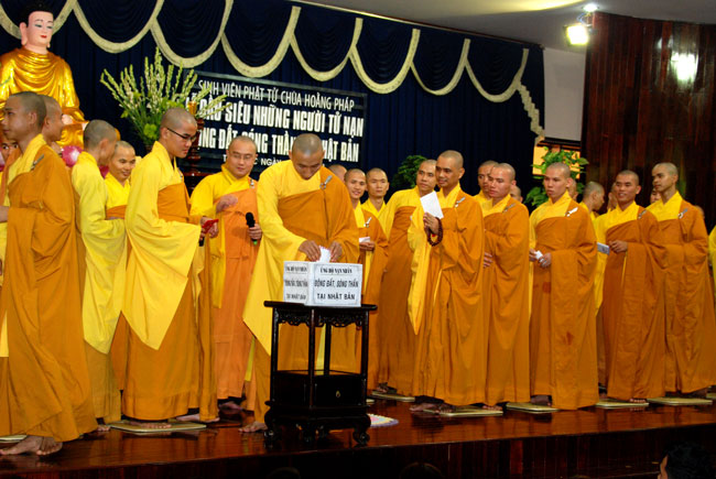 Cuối ngày, Thượng tọa đã phát động các bạn trẻ quyên góp, ủng hộ tịnh tài để chia sớt phần nào những khó khăn về vật chất của các bạn Nhật Bản hiện giờ. Từng hàng, từng hàng lần lượt tiến lên, các bạn lặng lẽ bỏ vào thùng ủng hộ những món tiền của tâm nguyện từ bi. Tuy chỉ là những món tiền nho nhỏ, nhưng sự hướng tâm muốn làm cho người bớt khổ của các bạn thật đáng trân trọng.