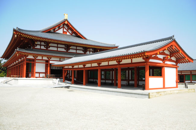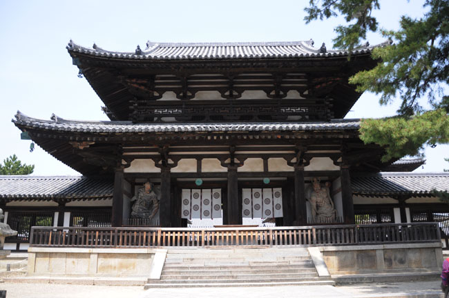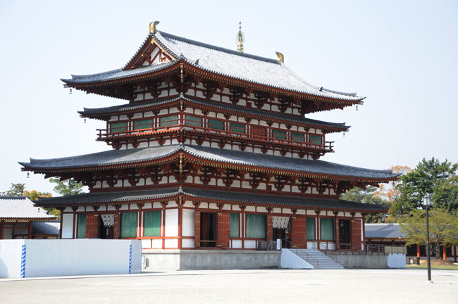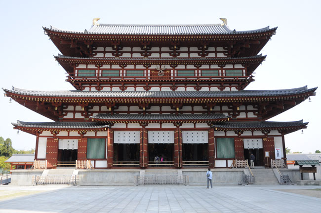 Giữa hai tòa tháp là chánh điện, thờ tượng Dược Sư Như Lai cao 4,55m và hai vị bồ tát là Nhật Quang, Nguyệt Quang Bồ-tát cao 3,2m đều là những bức tượng cổ bằng đồng mạ vàng được tạo theo phong cách thời Asuka với những đặc trưng của nghệ thuật điêu khắc tượng Phật Ấn độ thời bấy giờ.