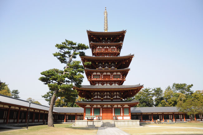 Chùa có hai tháp lớn Tây Tháp và Đông Tháp. Đông Tháp là kiến trúc duy nhất còn nguyên từ thế kỷ thứ VIII với chiều cao 34m. Hiện tại, tòa tháp này đang được bảo trì khi đoàn đến thăm. Bên cạnh đó là Tây Tháp, tòa tháp này bị cháy trong thế chiến thứ hai và mới được sửa chữa cách đây 30 năm.