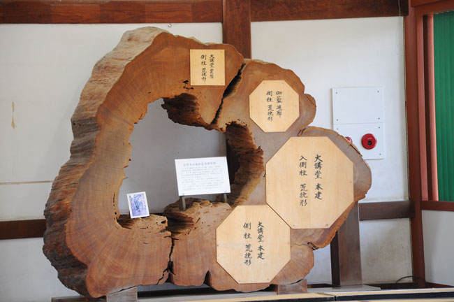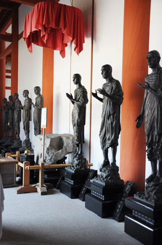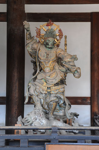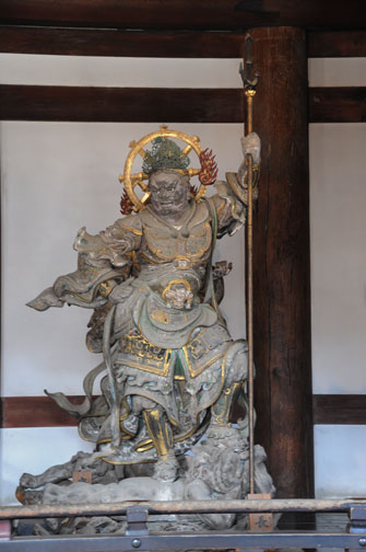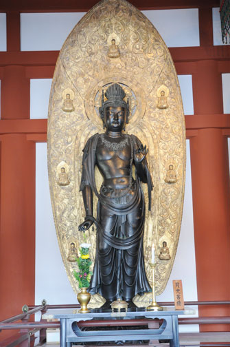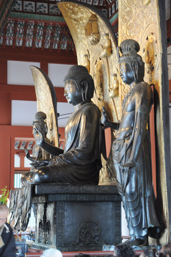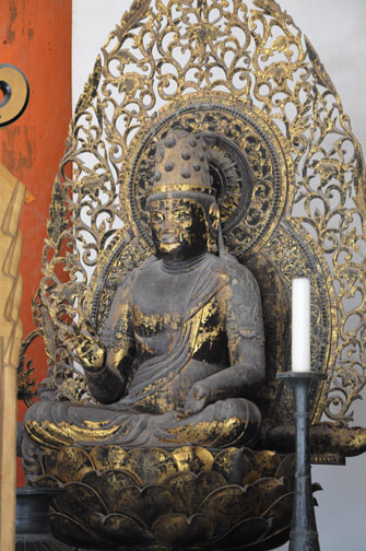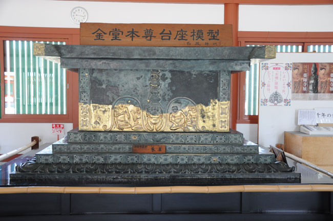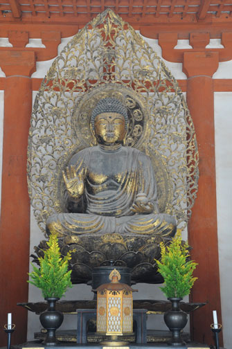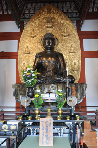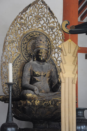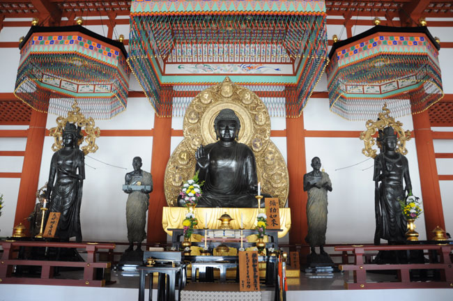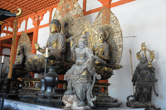 Gian phía Đông của chánh điện có tượng Phật Dược Sư. Gian phía Tây có tượng Phật A Di Đà. Ở 4 góc Tu Di Đàn của Chánh điện có tượng Tứ Thiên Vương bằng gỗ. Ở hai phía trái, phải bộ tam tượng Thích Ca có Cát Tường Thiên và Tỳ Sa Môn Thiên với niên đại từ thời Bình An. Phía sau mặt Bắc của Chánh điện là tượng đắp có niên đại từ thời Nara.