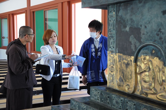 Buổi sáng, đoàn đến thăm chùa Dược Sư tại tỉnh Nara. Sau khi mua vé, chúng tôi được anh Hashimoto Takanori làm hướng dẫn viên dẫn đi một vòng tham quan chùa. Được biết, chùa Dược Sư xây vào năm 680 bởi Thiên hoàng Temmu để cầu an cho hoàng hậu Jito. Nhưng khi ngôi chùa vừa hoàn thành năm 698 thì Thiên hoàng băng hà. Chùa được di dời về vị trí hiện tại vào năm 718.