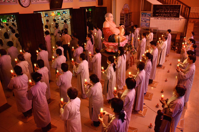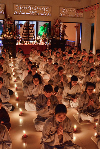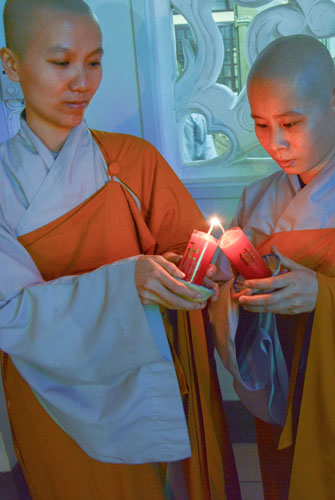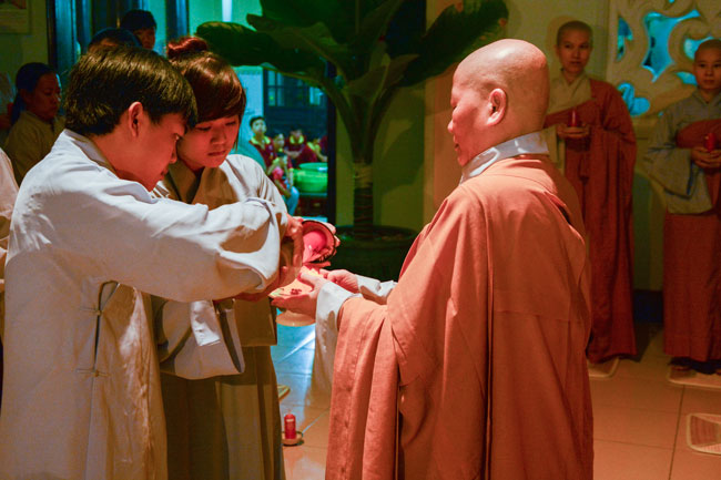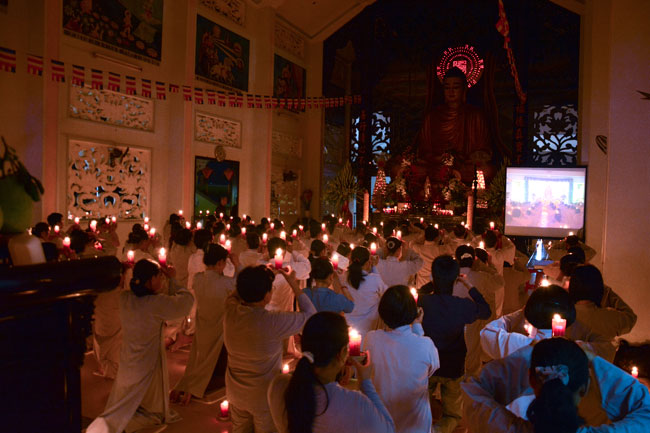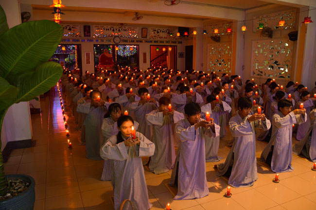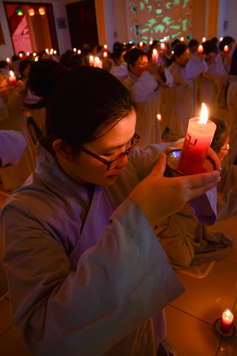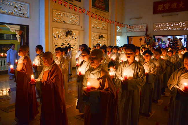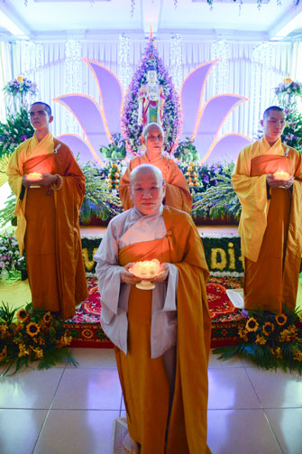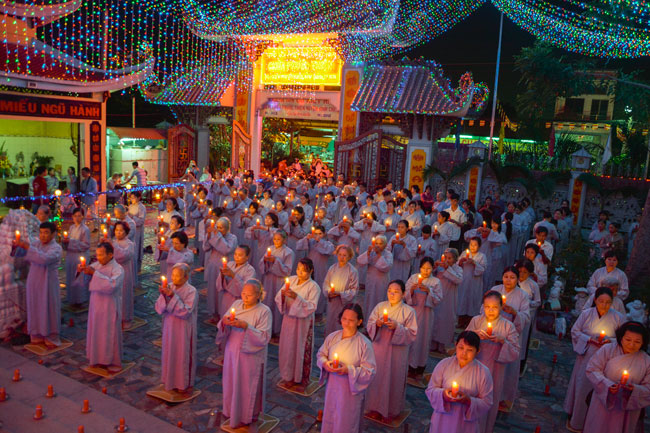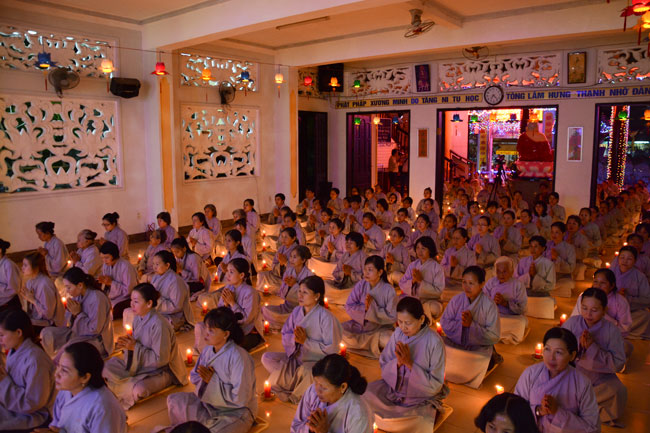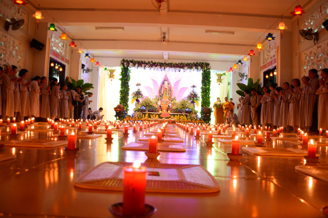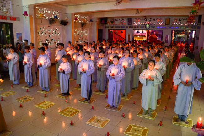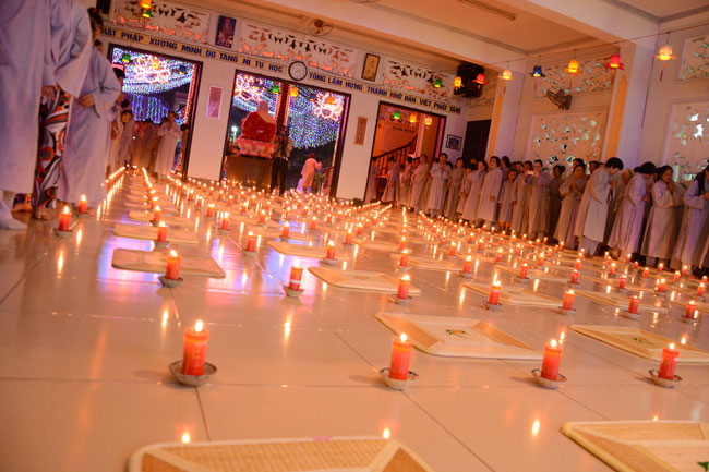 Từ bàn Phật, ngọn nến trong tay Thượng tọa chứng minh được thắp lên và truyền trao cho Ni sư trụ trì rồi dần lan tỏa khắp hội chúng. Tay truyền tay, nến truyền nến biểu trưng cho sự hòa hợp của Tăng già và sự truyền thừa giáo pháp của Như Lai. Những ngọn nến được thắp lên, sáng cả một góc trời như nói lên giáo pháp của đức Như Lai sẽ ngày càng tỏa rạng, soi rọi cho những ai còn đang lạc lối . Mong sao áng sáng ấy sẽ được gìn giữ bằng lòng từ bi và trí tuệ của người con Phật có như thế mới đúng với ý nghĩa của đêm hội hoa đăng này