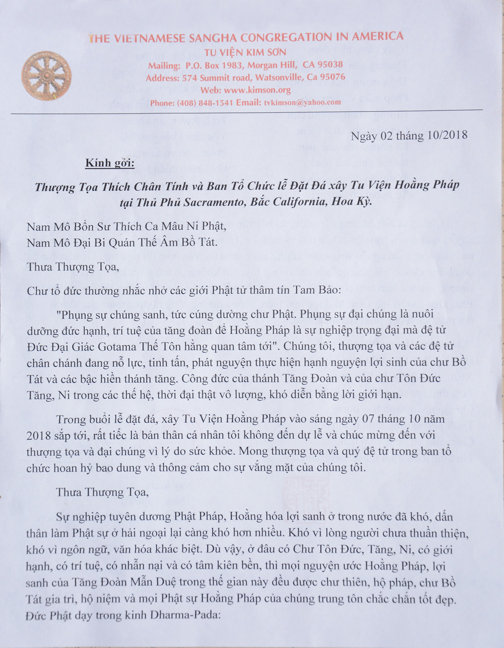 Nhập khóa Khóa tu Phật thất - lần 107 Thư chúc mừng lễ đặt đá xây dựng chùa Hoằng Pháp tại Hoa Kỳ Cập nhật: 24/10/2018 Facebook Google Tweet Danh mục tin tức Tin tức liên quan Chương trình từ thiện “Phương tiện nghĩa tình” 16/12/2025 Phóng sinh tại bến phà Bình Mỹ 14/12/2025 Chùa Đống Cao – Thanh Hoá: Khoá tu niệm Phật một ngày 09/12/2025 Khoá tu thiếu nhi “Em về bên Phật” Lần thứ 70 07/12/2025 Hiến máu nhân đạo 07/12/2025 Xem tất cả Các tin đã đưa: Xem tin đến hôm nay Xem tin trở về trước