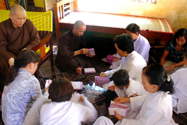 Quý thầy và Phật tử đang chuẩn bị những phần quà