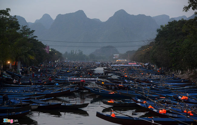Trong ngày khai hội chùa Hương (Hà Nội), mặc dù lượng khách vắng hơn so với cùng ngày này các năm trước, thuyền bè vẫn dày đặc trên suối Yến chờ đưa đón du khách.