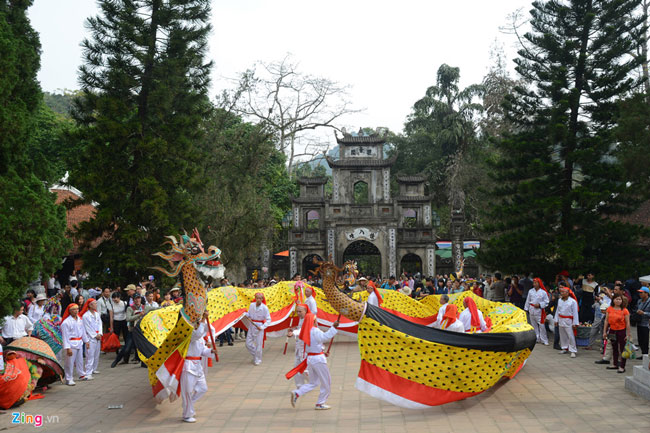 Sau khai hội, các đội múa rồng, lân sư tưng bừng biểu diễn trước sân chùa phục vụ khách tham quan.
