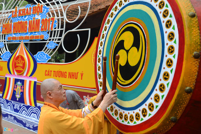 Sư trụ trì Thích Minh Hiền gióng hồi trống khai hội chùa Hương. L