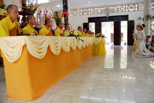 Cuối buổi lễ, Thượng tọa, thay mặt cho chư tôn đức Tăng chứng minh trao tặng cho đôi bạn xâu chuỗi làm vật kỷ niệm và cử hành lễ quy y Tam Bảo cho chú rể.