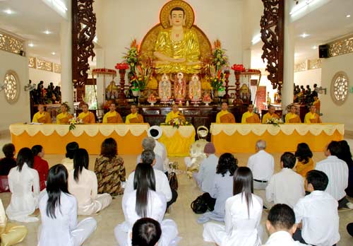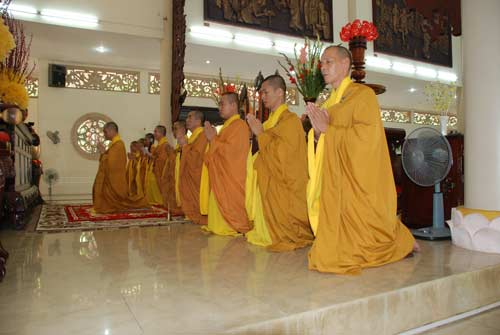Buổi lễ bắt đầu lúc 8 giờ sáng trong chánh điện chùa, với sự chứng minh của chư tôn đức tăng chùa Hoằng Pháp.