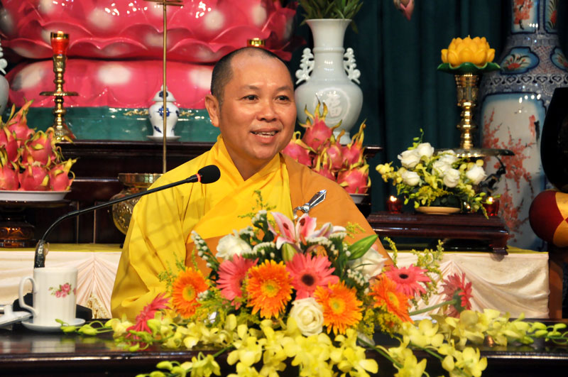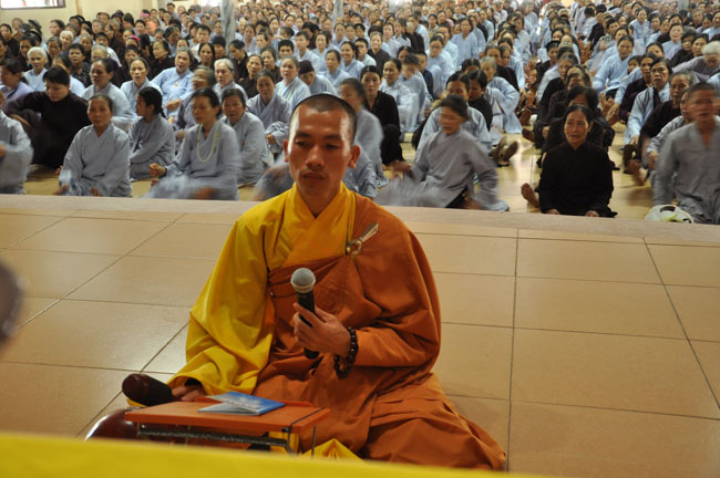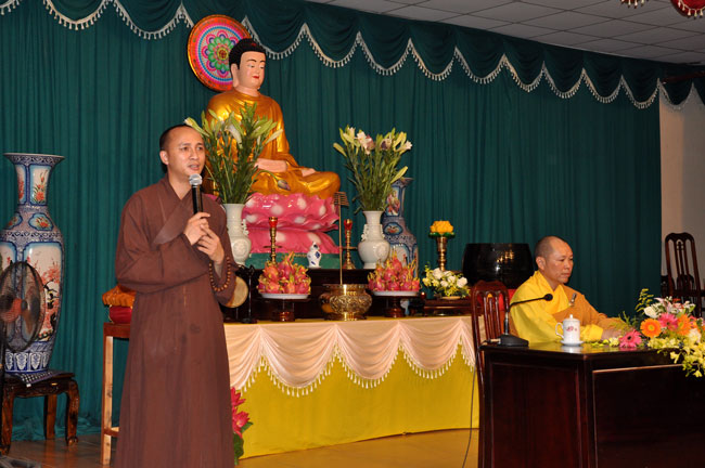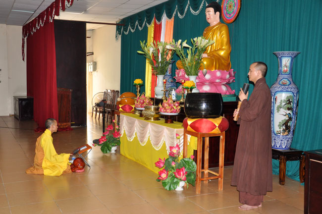 Trong buổi pháp thoại, Thượng tọa chia sẻ với quý Phật tử về đề tài “Ý nghĩa của việc quy y Tam Bảo”. Theo tài liệu Phật học Phổ thông của Hòa thượng Thích Thiện Hoa, Tam bao có 3 bậc: “Đồng thể Tam bảo, Xuất thế gian Tam bảo và thế gian Trụ trì Tam bảo”. Trong 3 bậc Tam bảo này có thể quy về sự quy y Tam bảo và lý quy y Tam bảo. Sự quy y Tam bảo là thờ Phật, lễ Phật; tụng kinh, nghe pháp; tôn trọng cung kính chư Tăng. Lý quy y Tam bảo là quay về với Phật tánh của mình; Khai thác đức tánh Từ bi, trí tuệ của mình; trở về bản tánh thanh tịnh, hòa hợp của mình. Muốn đi đến lý quy y Tam bảo người Phật tử cần phải thực hành sự quy y Tam bảo. Nhờ có đến chùa lễ Phật, nghe pháp, theo sự chỉ dẫn của chư Tăng mới có thể hiểu biết và thực hành theo đúng lời Phật dạy để được lợi ích an lạc ở hiện tại và tương lai.