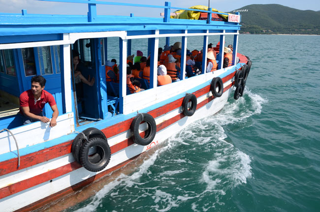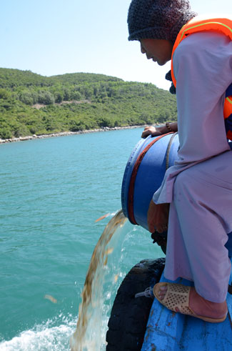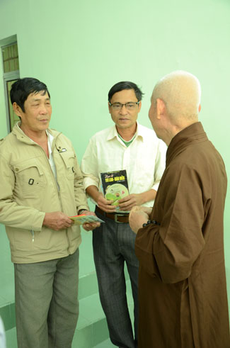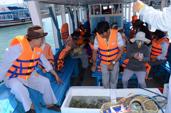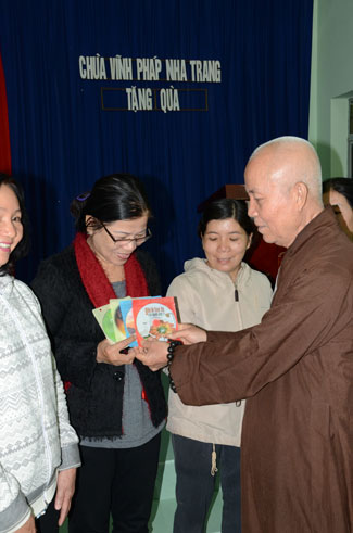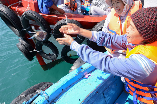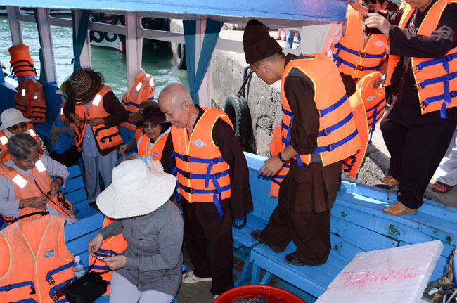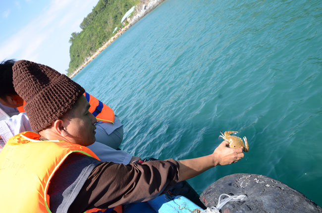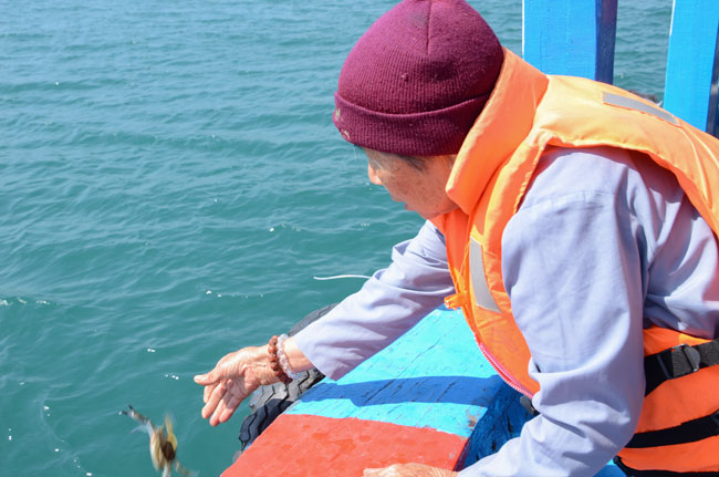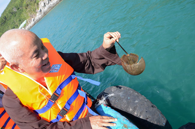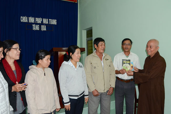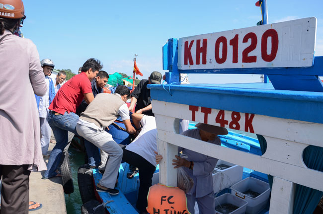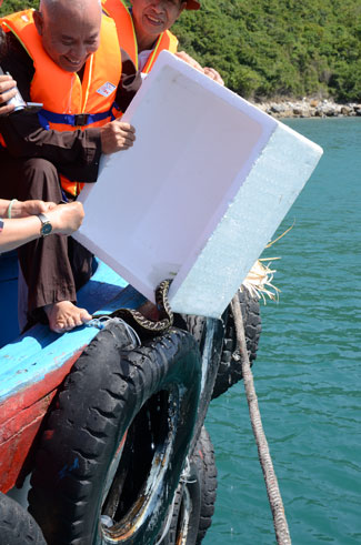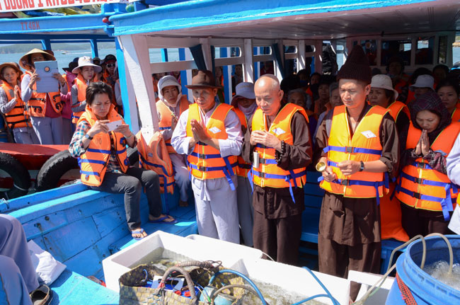 Tặng quà xong, đoàn cùng Đại đức Thích Tâm Đắc và Phật tử chùa Vĩnh Pháp (1 trong những chi nhánh của chùa Hoằng Pháp tại Tp Nha Trang) thu mua được một số ghẹ, cá chình, sam,… thuê tàu ra vịnh Nha Trang thả chúng trở về với biển cả.